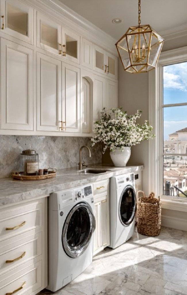 Structural assessment and reinforcement of laundry cabinets to safely support stone and solid-surface countertops.