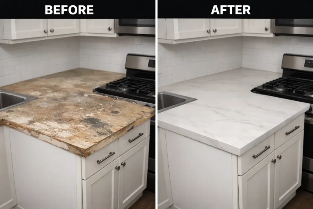 The before image shows an old, expired countertop with visible rust-like stains, surface wear, and aging materials that affected both appearance and usability.